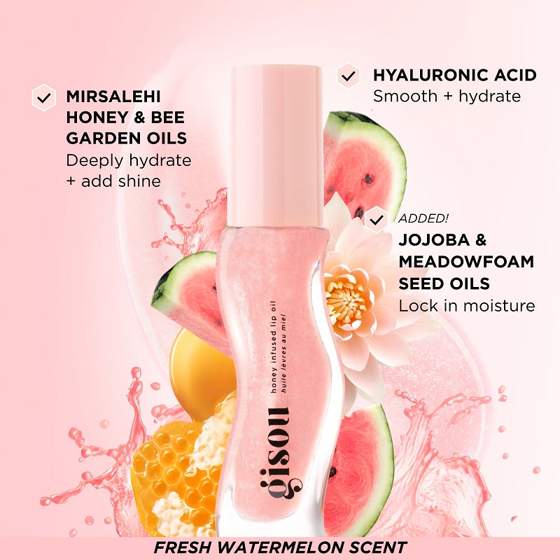 لیپ اویل «Watermelon Sugar» از مجموعه Honey Infused برند Gisou، ترکیبی از عسل Mirsalehi، روغنهای نقّی زنبور، روغن جوجوبا و اسید هیالورونیک است که لبها را عمیقاً آبرسانی میکند.