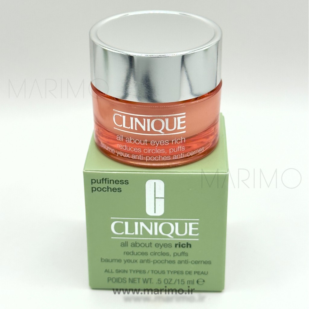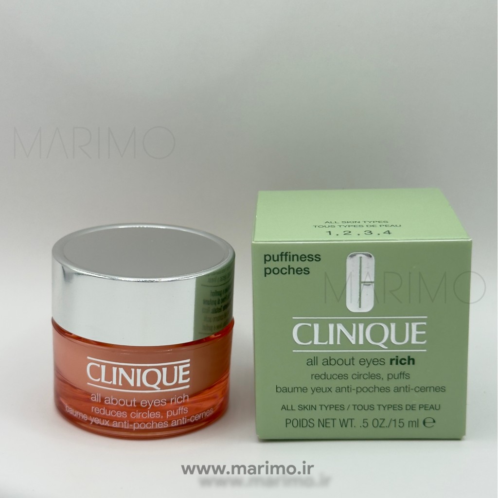 کرم دور چشم «All About Eyes» برند Clinique ترکیبی از فرمول سبک ژل-کرم دارد که مخصوص ناحیه دور چشم طراحی شده است. این محصول با فرمولی ۱۰۰٪ بدون عطر، بدون روغنهای سنگین، و تستشده توسط چشمپزشک و پوستشناس عرضه شده است.