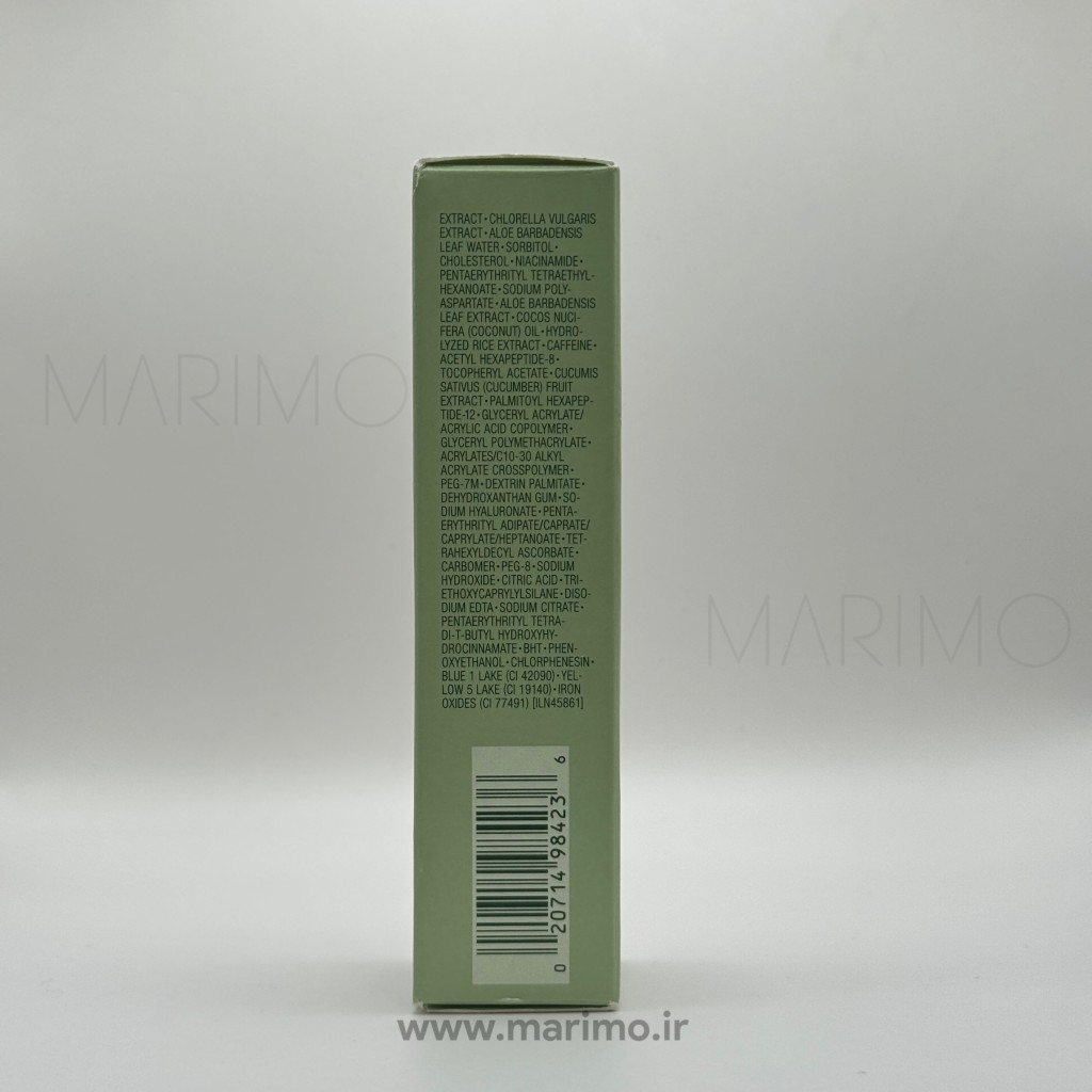 Water/Aqua/Eau; Glycerin; Butylene Glycol; Propanediol; Aloe Barbadensis Leaf Water; Hydroxyethyl Urea; Camellia Sinensis Leaf Extract; Algae Extracts; Niacinamide; Sodium Hyaluronate; Caffeine; Palmitoyl Hexapeptide-12; Tocopheryl Acetate (ویتامین E) …