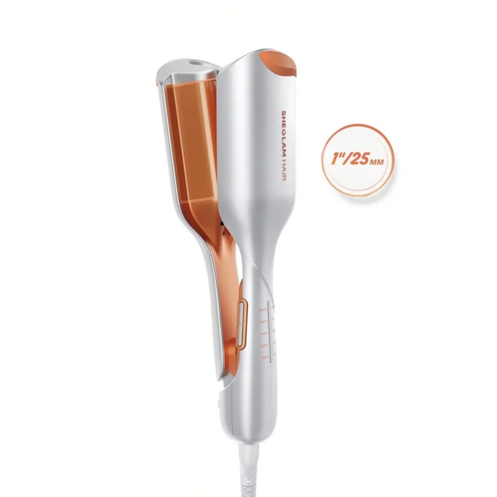 این دستگاه ویو شیگلم طراحیشده برای ایجاد موجهای طبیعی ساحلی (Beach Waves) با دو لوله سرامیکی، تنظیم دمای ۵ حالته و فناوری یون منفی برای موهایی نرم، براق و بدون وز.